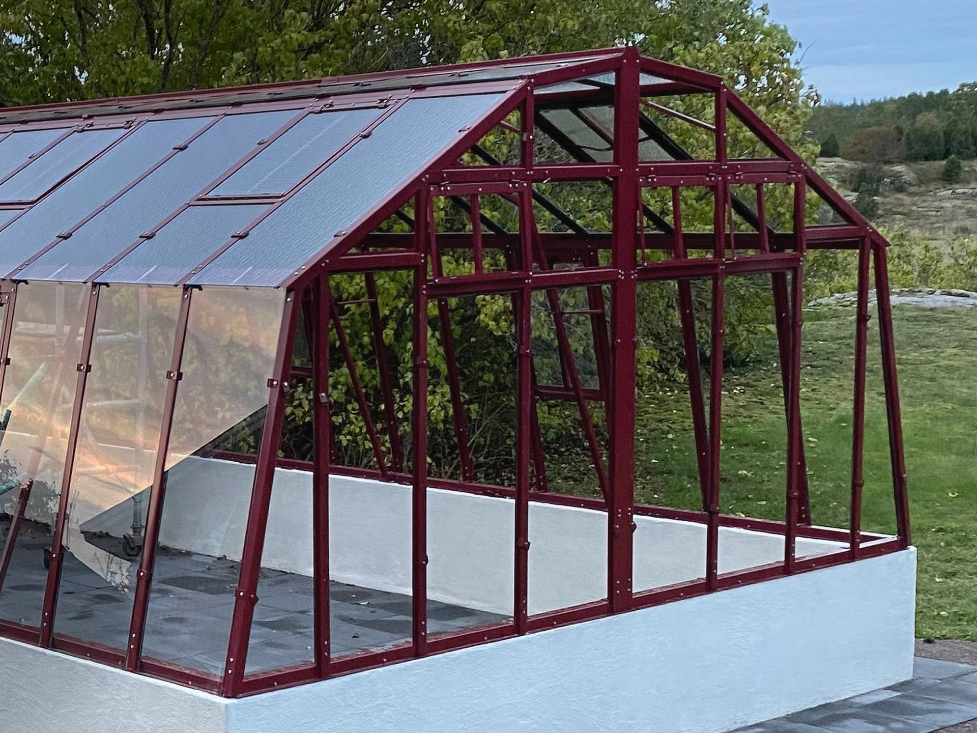 Med sin bredde på 426 cm, dobbelte pardøre i begge gavle og generøse arealer er Variant 426 en drivhusdrøm. Variant 426 er ikke overraskende et af vores mest værdsatte drivhuse, som også anvendes som udestue eller poolrum. Takket være den ekstremt holdbare stel, som fremstilles af galvaniseret stål, kan dette drivhus modstå stormstyrker på op til 33,3m/s og snebelastninger på op til 152 kg per kvadratmeter. Det er desuden muligt at tilpasse længden og udbygge drivhuset efterfølgende. Dette er ikke kun en drøm for gartnere. I takt med at nye ideer opstår, tilbyder Variant 426 plads til fantasi og kreativitet i mange år fremover.