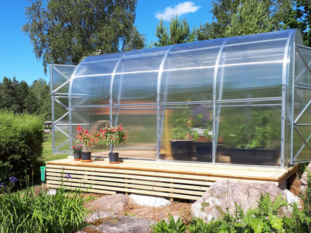 Vægge og tag er fremstillet af UV-beskyttet kanalplast i 6 mm polycarbonat, der monteres udvendigt for øget styrke og reducerede kuldebroer. Præskårne gavle medfølger for lettere montering.