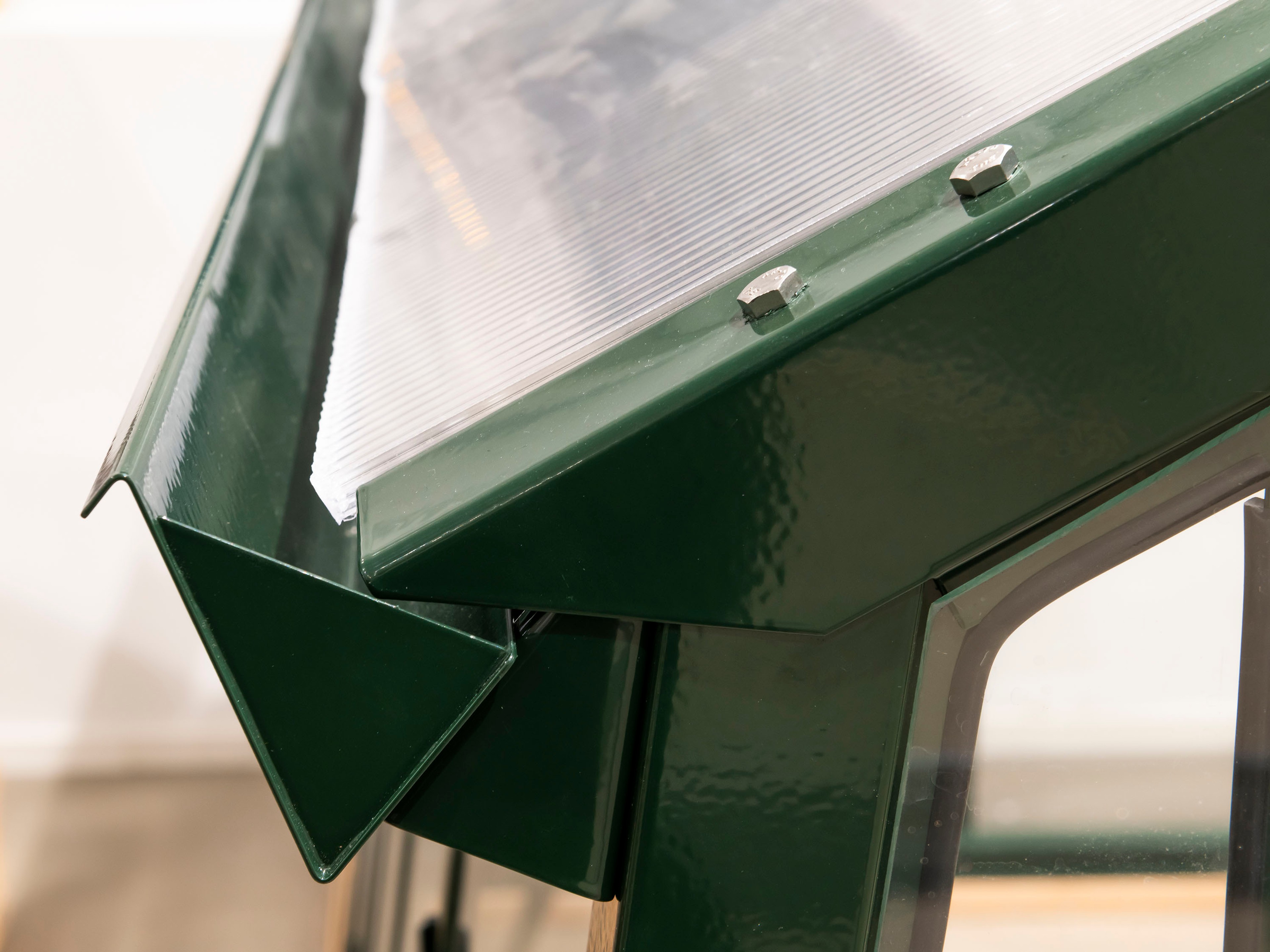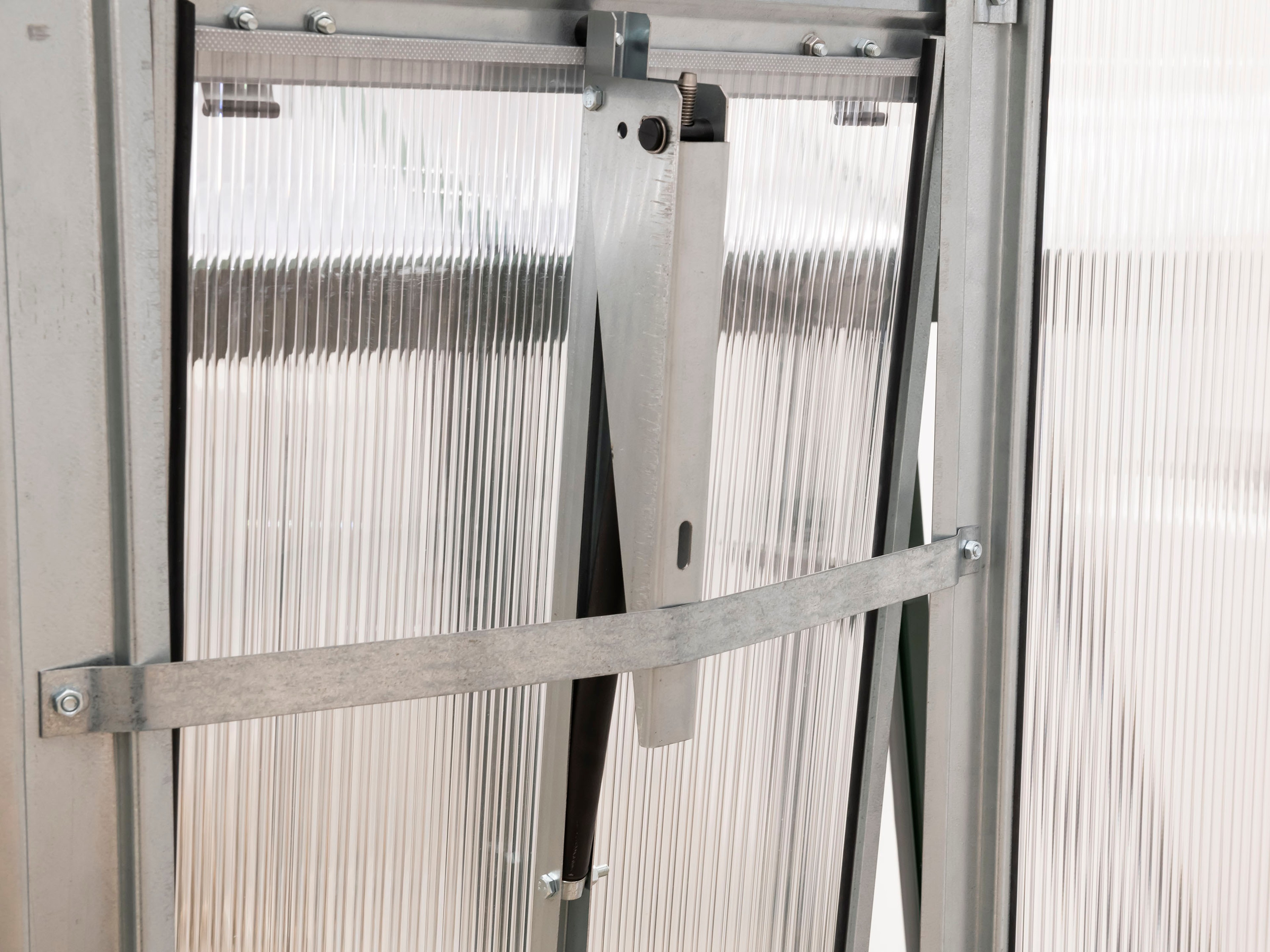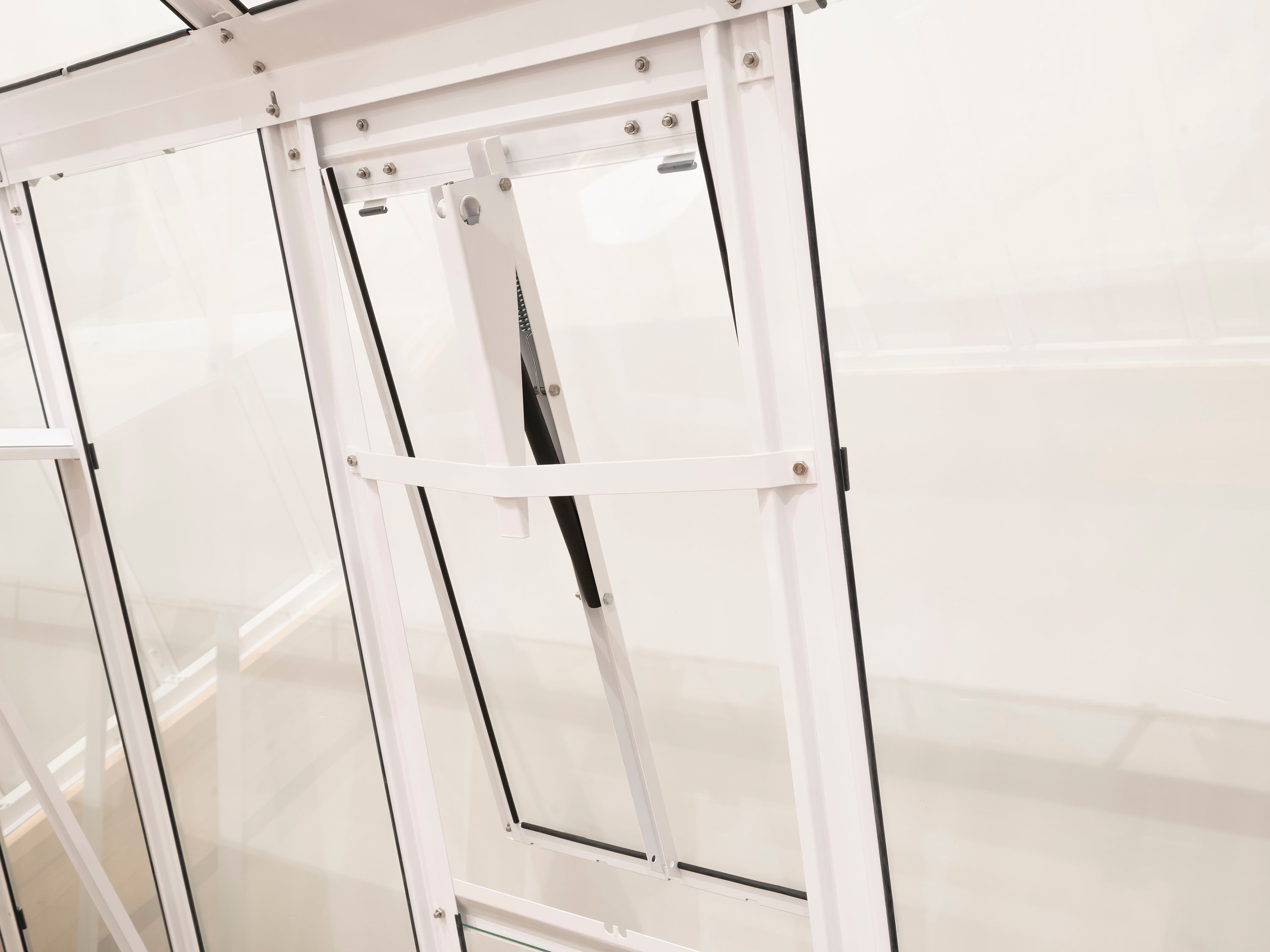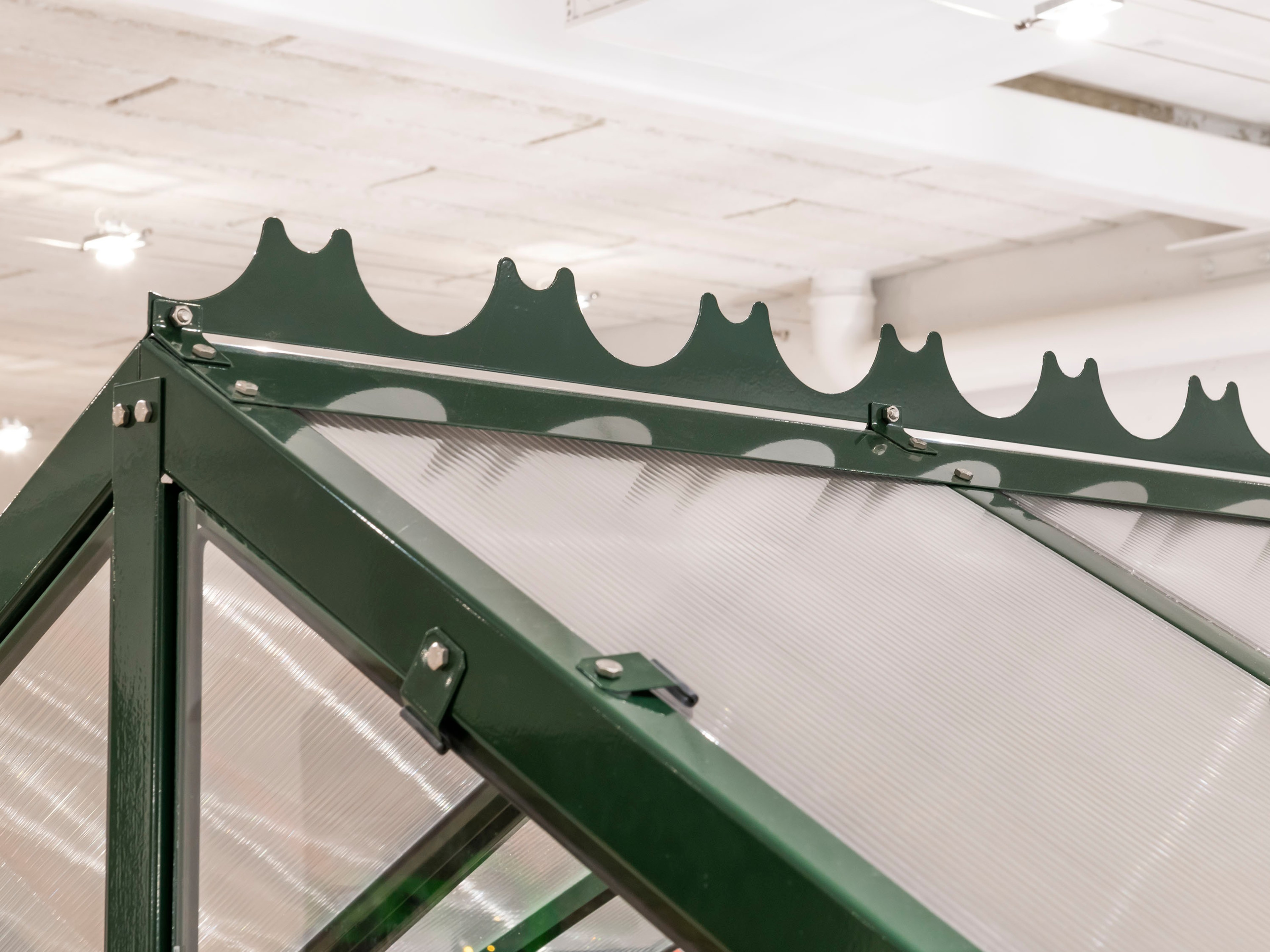 Variant 303 Mur muliggjør dyrking med rikelig plass i mange år fremover, da det er mulig å tilpasse lengden og bygge ut i etterkant. Dette drivhuset slipper også inn mer solenergi til plantene dine, ettersom veggene er svakt skrånende. Ved å tilpasse drivhuset til en murhøyde på 20, 40 eller 60 cm, oppnås en tilsvarende økning i takhøyden. Variant 303-M er et svært pålitelig drivhus som tåler vindstyrker på opptil 33,3 m/s og snølast på opptil 152 kg per kvadratmeter, takket være den ekstremt holdbare rammen i galvanisert stål.