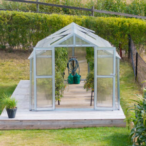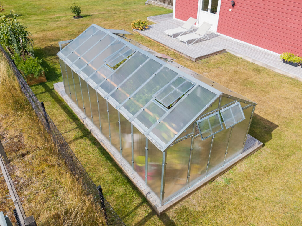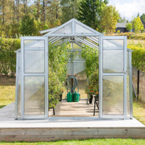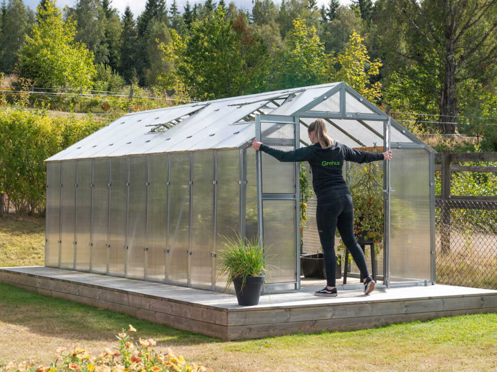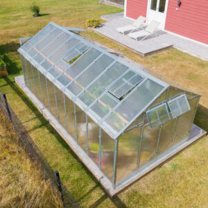 Om du i stället vill göra en egen grund till växthuset ska du kika på Variant 249 Standard – Med grundram. Då kan du bygga en egen grund/ram att placera växthuset på. Läs mer om grund och förankring här!