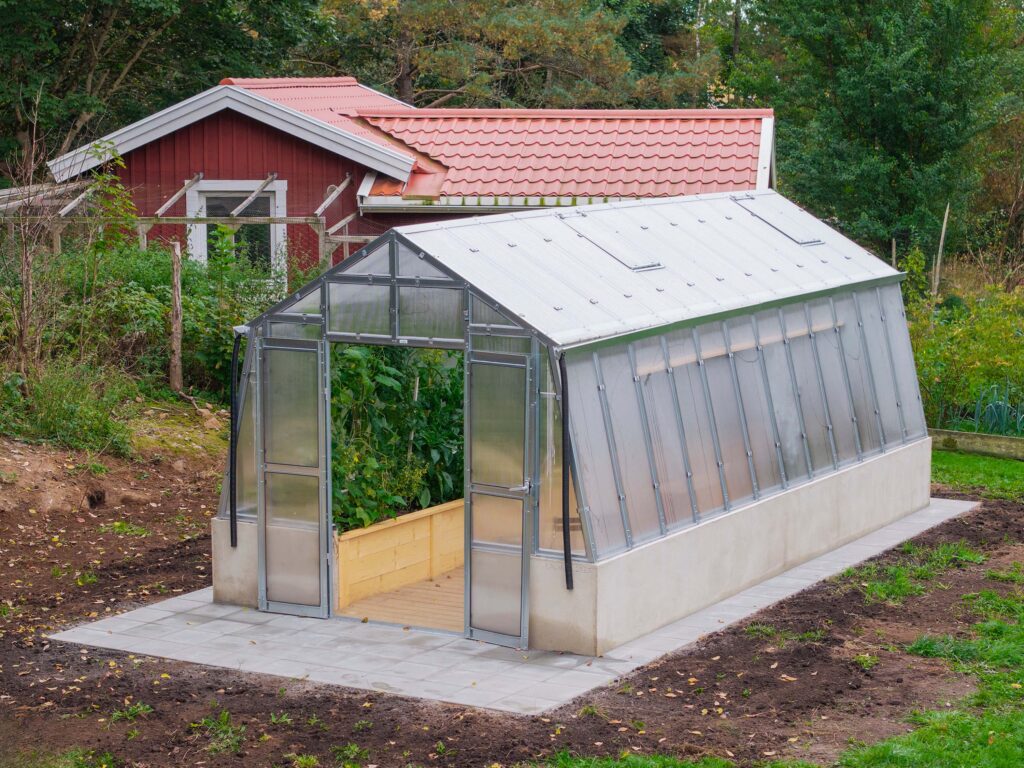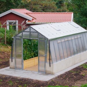Rymligt och smidig. Med en bredd på 303 cm och en höjd på 209 cm lämpar sig Variant 303 mycket väl både för odling av en mångfald av växter och som ett extra rum i trädgården. Väggarna i detta växthus lutar 76 grader vilket bidrar till att mer solenergi når växterna än i traditionella växthus med raka väggar.