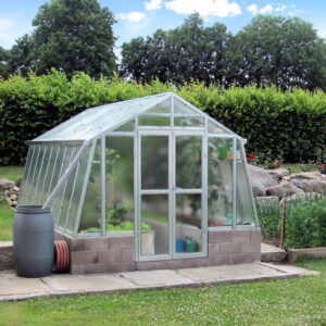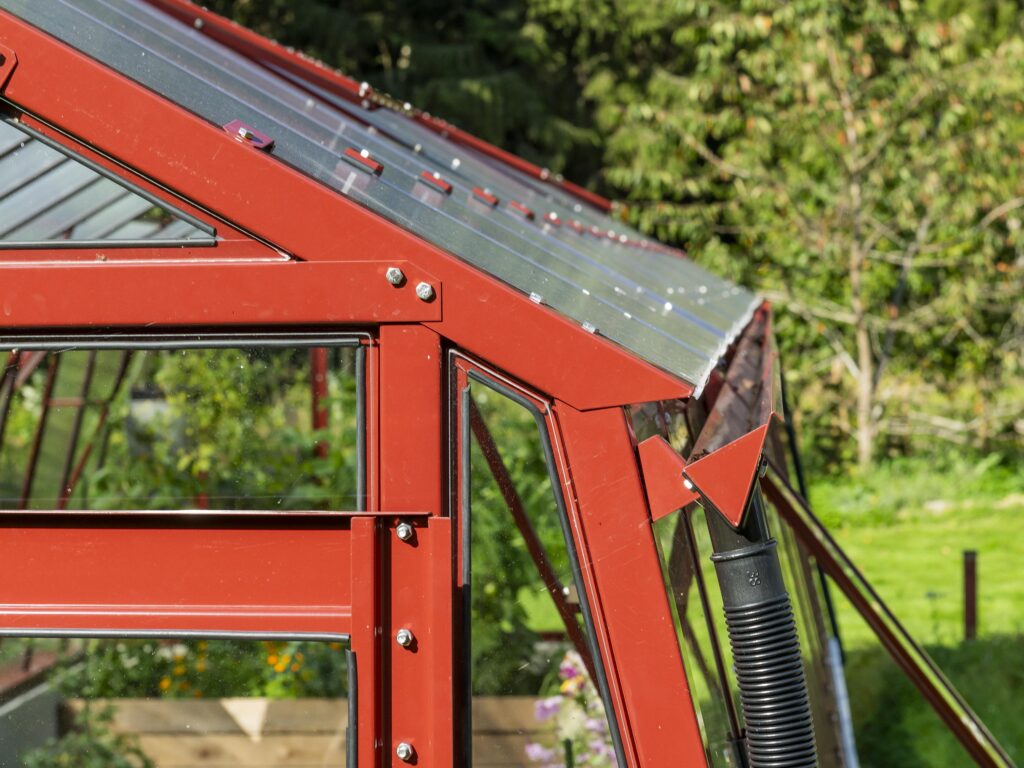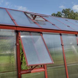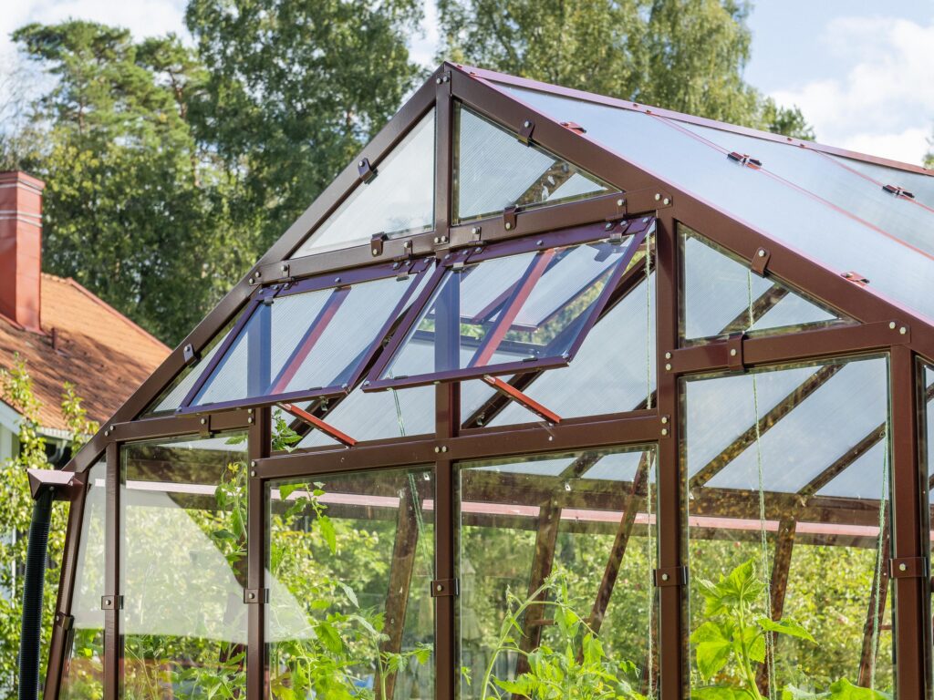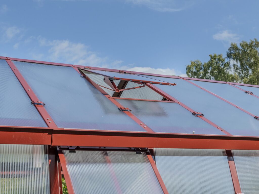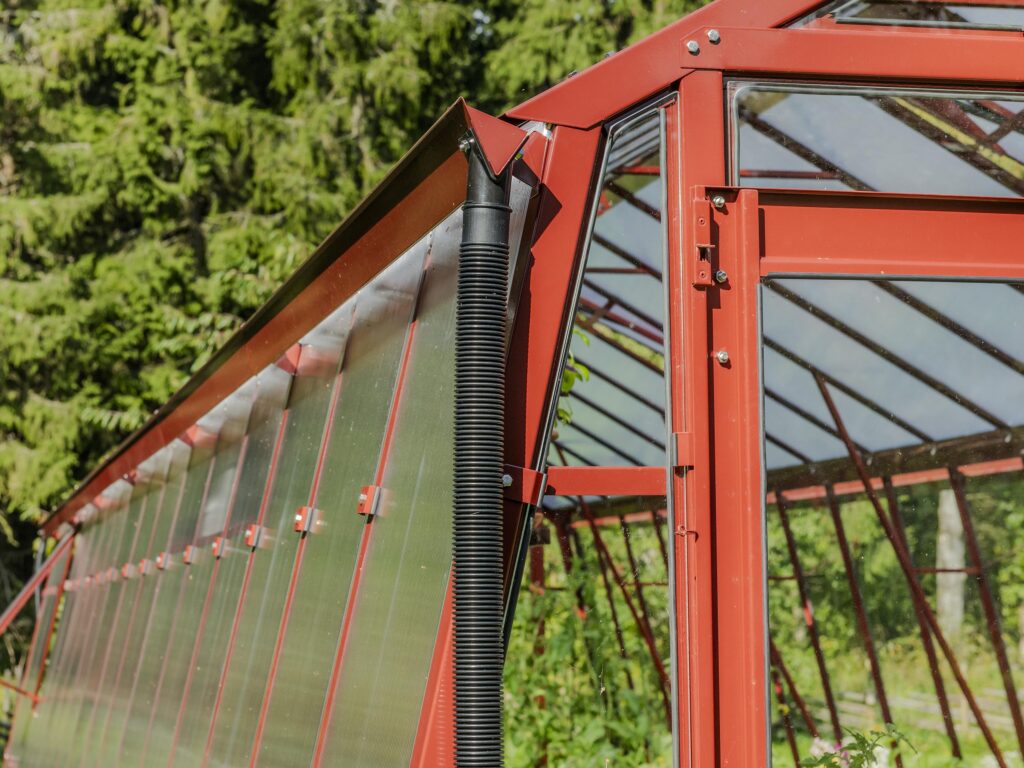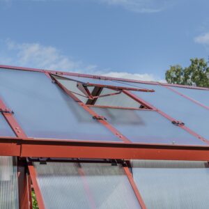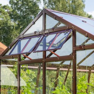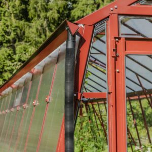 Ventilation och anpassningsbarhet. Dubbeldörr till den främre gaveln, takluckor och två öppningsbara luckor till bakgaveln ingår. Du kan också välja att byta ut de två medföljande bakgavelluckorna till en dubbeldörr samt välja till sidoluckor. Ventilation är en avgörande faktor när det gäller att skapa en optimal odlingsmiljö i ett växthus. Vi rekommenderar därför att takluckor förses med automatöppnare som öppnar och stänger luckorna helt automatiskt. Automatöppnare bidrar inte bara till en fullgod ventilation utan bidrar även till att göra växthuset så underhållsfritt som möjligt eftersom du inte behöver öppna och stänga takluckorna manuellt. Utöver takluckor och automatöppnare erbjuder vi även en rad andra tillbehör så att du kan anpassa detta stormsäkra växthus till dina specifika önskemål. Bland annat erbjuder vi olika bevattningssystem.