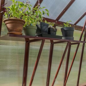 Hyllkonsoler på båda långsidor. Med hjälp av hyllkonsolerna kan du enkelt skapa en avlastningsyta eller plats för fördodlingar.